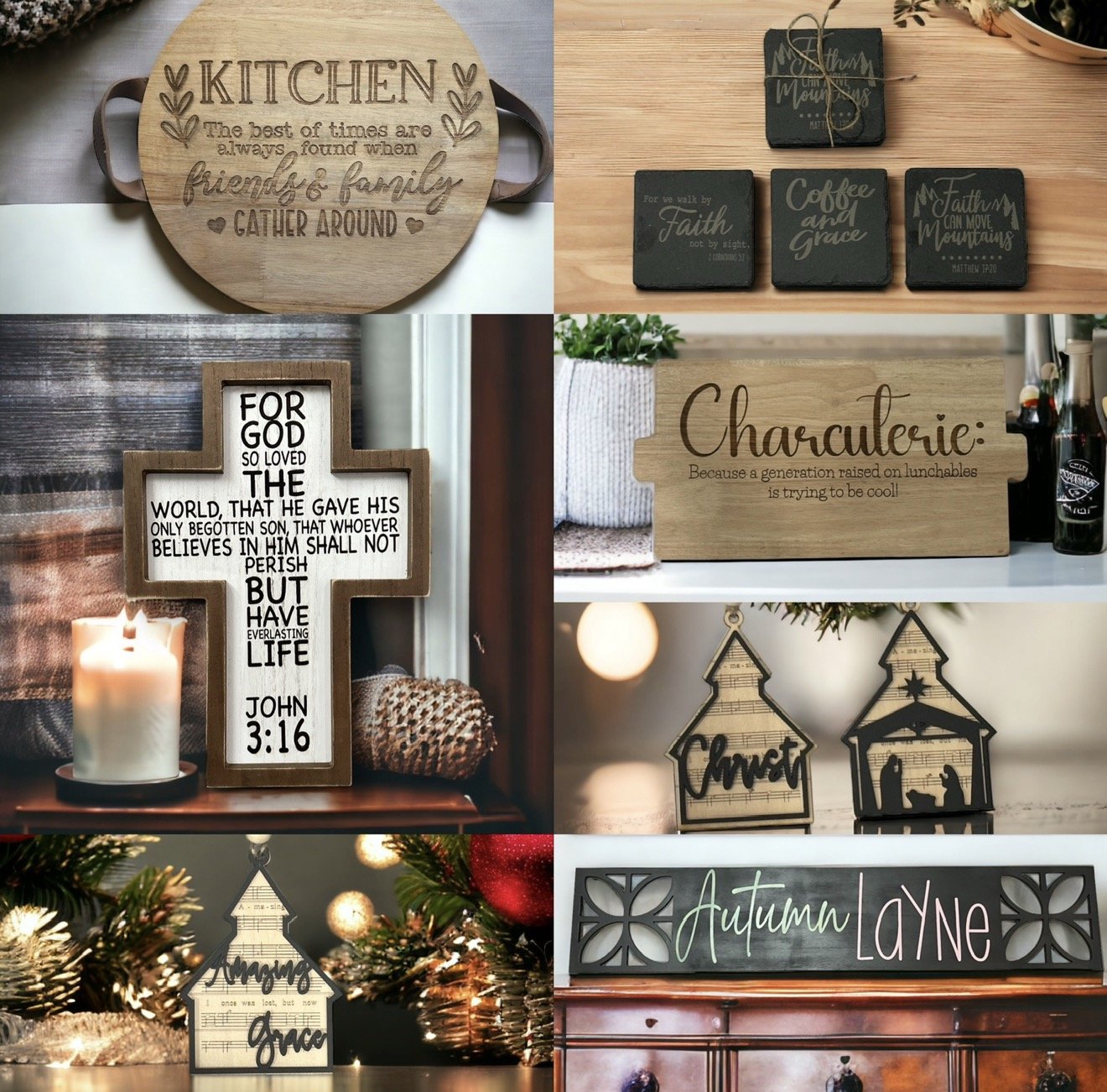 While Porch Leaners and Door Hangers are my favorite things to make, I also make custom signs, engraved pieces (wood, metal, leather, and more), t-shirts (DTF, vinyl, puff vinyl), DIY kits, and a variety of other handmade items.
